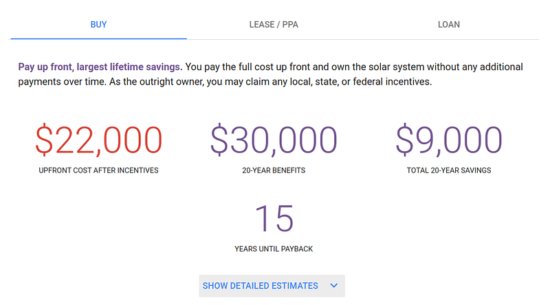 Let’s plug our number into Google’s Project Sunroof, and select the ‘Buy’ tab. This will show us some useful numbers. On the far left we show the total cost to us outright. This will be the cost of the system minus any tax credits we get. The second number is how much electricity we saved by going solar, minus any electricity costs we still may have from our utility.