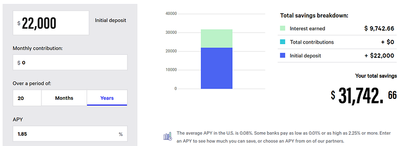 We could simply put the same amount of money we would spend on a solar system into a CD or money market account earning an interest rate of 1.85% for 20 years. We end up with the following: