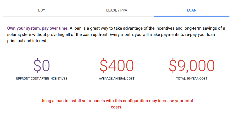 The ‘LOAN’ tab lays out the numbers a bit differently. We should see an upfront cost on the left of $0, since we aren’t paying anything out of pocket. In the middle we should see how much we can expect to save every year. This should be the difference between our current power bill and the monthly payment on the loan over a single year. Adding this up over 20 years we should see how much we save over the lifespan of the system on the right.