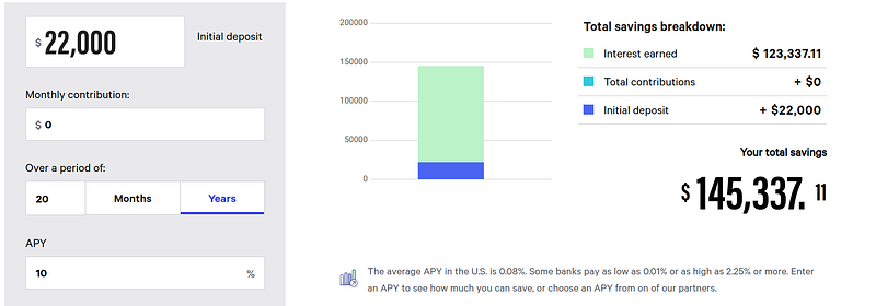 But here’s the thing: you typically would not invest in a money market or CD for such a long time frame. Historically, the S&P 500 averages about 10% per year. So if we simply bought a low cost S&P 500 index fund, this is what we should end up with: