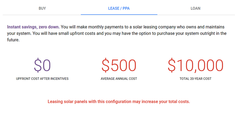 The layout for the lease/PPA is similar to the loan tab. We should see a $0 for upfront costs on the left, yearly savings in the middle, and savings over the 20 year span on the left. Clicking on ‘LEASE/PPA’ we see about what we expect:
